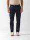 Pantalon chino bleu marine coupe semi-ajustée, confectionné en tissu de coton avec 2 % d’élasthanne. Fermeture par ceinture prolongée avec double bouton et cordon de serrage. Braguette zippée dissimulée, passants pour ceinture, deux poches avant, une poche ticket et deux poches arrière. Cheval brodé ton sur ton sur la poche arrière droite.